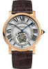 Cartier Rotonde de Cartier Flying Tourbillon Watch 40 mm by 10.6 mm thick 18K pink gold case, sapphire back, beaded crown set with sapphire cabochon, sapphire crystal, white dial with silvered open-work grid and Roman numerals with blued hands, caliber 9452 MC manual movement with flying tourbillon complication, seconds indicated by the C-shaped tourbillon carriage, brown alligator strap with 18K gold buckle, buckle double deployant. Water resistant to 30 meters.