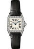 28.25mm x 21.65mm 18K white gold rodium finish case set with 48 brilliant cut diamonds, 5.5mm thick, octagonal shaped crown set with a cut diamond totalling 0.70 carats, sapphire crystal, silver dial with blued steel-sword shaped hands, quartz movement, brown alligator skin strap, 18K rhodium finish white gold buckle with folding buckle. Water resistant to 30 meters.