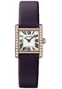 Small size, 18K pink gold case set with diamonds on the sides, silver dial, quartz movement, fabric strap with 18K gold deployant buckle. Water resistant to 30 meters (100 feet).