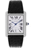 31 x 40.85 mm by 7.65 mm thick stainless steel case, beaded crown set with a synthetic spinel cabochon, sapphire crystal, silver dial with 12 Roman numerals and blued steel hands, caliber Cartier 049 automatic movement, black alligator strap, buckle double deployant. Water resistant to 30 meters.