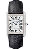 34.8mm x 27.4mm stainless steel case, 5.55mm thick, beaded crown set with a synthetic cabochon-shaped spinel, sapphire crystal, silvered opaline dial with blued-steel sword-shaped hands, quartz movement, black grained calfskin interchangeable strap, steel double adjustable folding buckle. Water resistant to 30 meters.