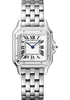 27mm x 37mm steel case, 6mm thick, steel crown with a synthetic blue spinel, sapphire crystal, silvered dial with Roman numerals and blued-steel sword-shaped hands, quartz movement, steel bracelet. Water resistant to 30 meters.