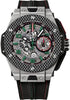 Hublot Big Bang Unico Ferrari Mexico Limited Edition of 50 Watch 45 mm titanium case, sapphire crystal back, black carbon fiber and composite resin lateral inserts and bezel end pieces, carbon fiber fused bezel with 6 H-shaped titanium screws, sapphire crystal with anti-reflective treatment, sapphire dial with red and green Mexico theme, HUB 1241 UNICO manufacture self-winding chronograph flyback movement, approximately 72 hours of power reserve, black Schedoni leather strap with red and green stitching and additional black rubber strap, deployant buckle. Water resistant to 100 meters.