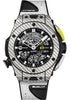 Hublot Big Bang Unico Golf Watch 45 mm carbon fiber and grey texalium upper layer case, carbon fiber and grey texalium upper layer bezel with 6 H-shaped polished titanium black pvp screws, sapphire crystal with anti-reflective treatment, matt black dial with satin-finished rhodium plated white luminescent appliques, MHUB158 manual-winding movement, approximately 72 hours of power reserve, black rubber and white calf strap, black ceramic and black-plated titanium deployant buckle. Water resistant to 100 meters.