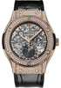 Hublot Classic Fusion Aerofusion Moonphase King Gold Pav Watch 45 mm (available in 42 mm) polished 18K king gold case set with 284 diamonds for 1.38cts, polished 18K King Gold bezel set with 126 diamonds for 1.41cts and 6 H-shaped titanium screws, sapphire crystal with anti-reflective treatment, sapphire dial, HUB 1131 self-winding movement with moonphase, approximately 42 hours of power reserve, black rubber and alligator strap, 18K red gold and black-plated stainless steel deployant buckle. Water resistant to 50 meters.