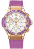 41mm 18K red gold case, 18K pink gold bezel set with 48 amethyst baguettes, purple composite resin lateral inserts and bezel lugs, mother of pearl dial, self winding HUB 4300 movement with chronograph function, approximately 42 hours of power reserve, purple rubber and gummy alligator strap with deployant buckle. Water resistant to 100 meters.