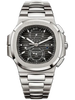 Patek Philippe Nautilus Travel Time Chronograph Watch 40.5 mm stainless steel case, sapphire-crystal back, black gradated dial with luminescent coated gold applied numerals, caliber CH 28-520 C FUS self-winding movement Nautilus Travel Time Chronograph (chronograph with 60-minute counter, dual time zone mechanism indicating local and home time, local and home day/night indication in apertures, local date by hand, sweep seconds chronograph hand), approximately 45-55 hours of power reserve, stainless steel bracelet, Nautilus fold-over buckle. Water resistant to 120 m.