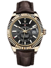 42mm 18K yellow gold case, screw-down back, screw-down crown, fluted bezel with bidirectional rotatable Rolex Ring Command, scratch-resistant sapphire crystal with cyclops lens over the date and double anti-reflective coating, black dial, index hour markers with Chromalight, Rolex calibre 9001 automatic movement , second time-zone displayed via off-center rotating disc, Saros annual calendar with date at 3 o'clock and month indicated in discrete apertures at each of the 12 hour marks, brown leather strap, folding Oysterclasp buckle. Waterproof to 100 meters.