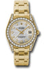 34mm 18K yellow gold case, end pieces set with 28 diamonds, screw-down crown, bezel set with 34 diamonds, scratch-resistant sapphire crystal with cyclops lens over the date, white mother-of-pearl dial, 10 diamond hour markers, Rolex calibre 2235 automatic movement, 18K yellow gold Pearlmaster bracelet with rounded five-piece links, concealed folding Crownclasp buckle. Water resistant to 100 meters.