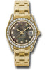 34mm 18K yellow gold case, end pieces set with 28 diamonds, screw-down crown, bezel set with 34 diamonds, scratch-resistant sapphire crystal with cyclops lens over the date, black mother-of-pearl dial, 10 diamond hour markers, Rolex calibre 2235 automatic movement, 18K yellow gold Pearlmaster bracelet with rounded five-piece links, concealed folding Crownclasp buckle. Water resistant to 100 meters.