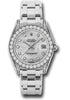 34mm 18K white gold case, end pieces set with 28 diamonds, screw-down crown, bezel set with 34 diamonds, scratch-resistant sapphire crystal with cyclops lens over the date, white mother-of-pearl dial, 10 diamond hour markers, Rolex calibre 2235 automatic movement, 18K white gold Pearlmaster bracelet with rounded five-piece links, concealed folding Crownclasp buckle. Water resistant to 100 meters.