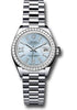 28mm platinum case, screw-down crown with twinlock double waterproofness system, domed bezel set with 44 diamonds, scratch-resistant sapphire crystal with cyclops lens over the date and double anti-reflective coating, ice blue dial, 36 diamonds set in index hour markers and 8 diamond set in Roman numeral IX, Rolex calibre 2236 automatic movement with center hour, minute and seconds hands, instantaneous date with rapid setting, and stop-seconds for precise time setting, platinum President bracelet with semi-circular three-piece links, concealed folding Crownclasp buckle. Waterproof to 100 meters.