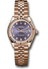 28mm 18K Everose gold oyster case, screw-down crown with twinlock double waterproofness system, fluted bezel, scratch-resistant sapphire crystal with cyclops lens over the date and double anti-reflective coating, aubergine dial, diamond hour markers, Rolex calibre 2236 automatic movement with center hour, minute and seconds hands, instantaneous date with rapid setting, and stop-seconds for precise time setting, 18K Everose gold Jubilee bracelet with five-piece links, concealed folding Crownclasp buckle. Waterproof to 100 meters.