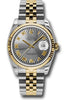 36mm stainless steel case, 18K yellow gold fluted bezel, steel grey sunbeam dial, Roman numerals, and stainless steel and 18K yellow gold Jubilee bracelet.