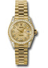 26mm 18K yellow gold case, case lugs set with 24 diamonds, bezel set with 42 diamonds, champagne jubilee dial, diamond hour markers, and President bracelet.