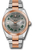 41mm Everose Rolesor case with 904L steel monobloc middle case, screw-down steel back, 18K Everose gold screw-down crown, 18K Everose gold smooth bezel, scratch-resistant double anti-reflective sapphire crystal with cyclops lens over the date, slate gray dial, green Roman numerals, Rolex calibre 3235 perpetual self-winding movement with date at 3 o'clock that changes instantaneously at midnight in a few thousandths of a second, approximately 70 hours of power reserve, Everose Rolesor Oyster bracelet made from a combination of 904L steel and 18K Everose gold with flat three-piece links, folding Oysterclasp buckle with Easylink 5mm comfort extension link. Waterproof to 100 meters.
