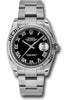 36mm stainless steel case, 18K white gold fluted bezel, black dial, Roman numerals, and Oyster bracelet.