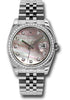36mm stainless steel case, 18K white gold bezel set with 52 brilliant-cut diamonds, dark mother of pearl dial, diamond hour markers, and stainless steel Jubilee bracelet.