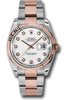 36mm stainless steel case, 18K Everose gold screw-down crown, 18K Everose gold fluted bezel, scratch-resistant sapphire crystal with cyclops lens over the date, white dial, diamond hour markers, Rolex calibre...
