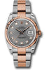 36mm stainless steel case, 18K Everose gold screw-down crown, 18K Everose gold fluted bezel, scratch-resistant sapphire crystal with cyclops lens over the date, steel dial, Roman numerals, Rolex calibre 3135 automatic movement, stainless steel and 18K Everose gold Oyster bracelet with three-piece links, folding Oysterclasp buckle with Easylink 5mm comfort extension link. Waterproof to 100 meters.