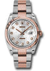 36mm stainless steel case, 18K Everose gold screw-down crown, 18K Everose gold fluted bezel, scratch-resistant sapphire crystal with cyclops lens over the date, silver Jubilee dial, diamond hour markers, Rolex calibre 3135 automatic movement, stainless steel and 18K Everose gold Oyster bracelet with three-piece links, folding Oysterclasp buckle with Easylink 5mm comfort extension link. Waterproof to 100 meters.