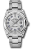 36mm stainless steel case, domed bezel, silver deco dial, blue Arabic numerals, and Oyster bracelet.