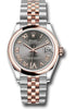 31mm Everose Rolesor case comprised of Oystersteel and 18K Everose gold, screw-down back, screw-down crown with twinlock double waterproofness system, 18K Everose gold domed bezel, scratch-resistant sapphire crystal with cyclops lens over the date, dark rhodium dial, Roman numerals with diamond set 6, Rolex calibre 2236 perpetual self-winding movement with date at 3 o'clock, approximately 55 hours of power reserve, Everose Rolesor Jubilee bracelet with semi-circular three-piece links, concealed folding Crownclasp buckle. Waterproof to 100 meters. Baselworld 2019 release.