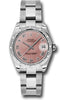 31mm stainless steel case, 18k white gold domed bezel set with 24 diamonds, pink dial, Roman numerals, and Oyster bracelet.