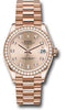 31mm 18K Everose gold case, screw-down crown with twinlock double waterproofness system, bezel set with 46 diamonds, scratch-resistant sapphire crystal with cyclops lens over the date, ros dial, diamond hour markers, Rolex calibre 2236 automatic movement with center hour, minute and seconds hands, instantaneous date with rapid setting, and stop-seconds for precise time setting, approximately 55 hours of power reserve, 18K Everose gold President bracelet with semi-circular three-piece links, concealed folding Crownclasp buckle. Waterproof to 100 meters. Baselworld 2019 release.