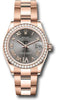 31mm 18K Everose gold case, screw-down crown with twinlock double waterproofness system, bezel set with 46 diamonds, scratch-resistant sapphire crystal with cyclops lens over the date, dark rhodium diamond Roman IV dial, Roman numerals with 11 diamonds set on VI, Rolex calibre 2236 automatic movement with center hour, minute and seconds hands, instantaneous date with rapid setting, and stop-seconds for precise time setting, approximately 55 hours of power reserve, 18K Everose gold Oyster bracelet with flat three-piece links, concealed folding Crownclasp buckle. Waterproof to 100 meters. Baselworld 2019 release.