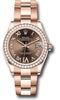 31mm 18K Everose gold case, screw-down crown with twinlock double waterproofness system, bezel set with 46 diamonds, scratch-resistant sapphire crystal with cyclops lens over the date, chocolate diamond Roman IV dial, Roman numerals with 11 diamonds set on VI, Rolex calibre 2236 automatic movement with center hour, minute and seconds hands, instantaneous date with rapid setting, and stop-seconds for precise time setting, approximately 55 hours of power reserve, 18K Everose gold Oyster bracelet with flat three-piece links, concealed folding Crownclasp buckle. Waterproof to 100 meters. Baselworld 2019 release.