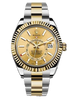 DESCRIPTION: Rolex Oyster Sky-Dweller 42 Watch 326933 ch 42mm yellow Rolesor case comprised of a 904L steel monobloc middle case, screw-down back, screw-down crown, 18K yellow gold fluted bezel with bidirectional rotatable Rolex Ring Command, scratch-resistant sapphire crystal with cyclops lens over the date and double anti-reflective coating, champagne dial, index hour markers, Rolex calibre 9001 automatic movement , second time-zone displayed via off-center rotating disc, Saros annual calendar with date at 3 o'clock and month indicated in discrete apertures at each of the 12 hour marks, stainless steel and 18K yellow gold Oyster bracelet, folding Oysterclasp buckle with Easylink 5mm comfort extension link. Waterproof to 100 meters.