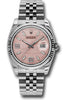 DESCRIPTION: Rolex Oyster Perpetual Datejust 36 Watch 116234 pwdaj 36mm stainless steel case, screw-down crown with twinlock double waterproofness system, 18K white gold fluted bezel, scratch-resistant sapphire crystal with cyclops lens over the date, pink wave dial, diamond set 6 and 9 Arabic numerals, Rolex calibre 3135 automatic movement, stainless steel Jubilee bracelet with five-piece links, concealed folding Crownclasp buckle. Waterproof to 100 meters..