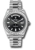 DESCRIPTION: Rolex Oyster Perpetual Day-Date 40 Watch 228238 bkbdp 40mm 18K yellow gold case, screw-down back with Rolex fluting, screw-down crown with twinlock double waterproofness system, fluted bezel, scratch-resistant double anti-reflective sapphire crystal with cyclops lens over the date, black dial, 10 baguette diamond hour markers, Rolex calibre 3255 automatic movement with centre hour, minute and seconds hands, instantaneous day and date in apertures, unrestricted rapid-setting, and stop-seconds for precise time setting, approximately 70 hours of power reserve, President bracelet with three-piece solid links comprised of a polished center link, satin-finished outer links, and ceramic inserts, concealed folding Crownclasp buckle. Waterproof to 100 meters.