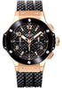 44mm 18k red gold case, black ceramic bezel, black carbon dial, self winding HUB 44 movement with chronograph function, approximately 42 hours of power reserve, black rubber strap with deployant buckle. Water resistant to 100 meters.