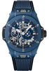 Hublot Big Bang MECA-10 Ceramic Blue Watch 45 mm microblasted and polished blue ceramic case, microblasted and polished blue ceramic bezel, sapphire crystal with anti-reflective treatment, mat blue skeleton dial, HUB1201 manual-winding movement with skeleton power reserve, approximately 10 Days of power reserve, black and blue structured lined rubber strap, black ceramic and black-plated titanium deployant buckle. Water resistant to 100 meters.