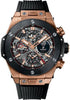 Hublot Big Bang Perpetual Calendar King Gold Ceramic Watch 45 mm polished and satin-finished 18K King Gold case, polished and satin-finished black ceramic bezel, black treated titanium lower bezel with 6 H-shaped titanium screws, sapphire crystal with anti-reflective treatment and Hublot logo printed on the inner side, sapphire dial with satin-finished gold-plated appliques, satin-finshed and microblasted gold-plated hands, white luminescent on both appliques and hands, HUB1270 UNICO manufacture self-winding movement with perpetual calendar and chrongraph, approximately 72 hours of power reserve, black structured and lined strap, black PVD titanium deployant buckle with 18K King Gold insert. Water resistant to 30 meters.