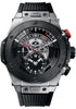 Hublot Big Bang Unico Bi-Retrograde Chrono Titanium Ceramic Watch 45 mm polished and satin-finished titanium case, polished and satin-finished titanium bezel, black composite resin lower bezel with 6 H-shaped black PVD titanium screws, sapphire crystal with anti-reflective treatment, mat and satin-finished black dial with red retrograde chronograph minute hand, white retrograde chronograph second hand, satin-finished and microblasted rhodium-plated minute-hour-small second hands, white luminescent, HUB1261 UNICO manufacture self-winding bi-retrograde movement with central chronograph and column wheel, approximately 72 hours of power reserve, black structured lined rubber strap, titanium deployant buckle with black ceramic insert. Water resistant to 100 meters.