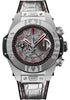 Hublot Big Bang Unico World Poker Tour Steel Watch 45 mm polished and microblasted stainless steel case, polished and microblasted stainless steel bezel, red composite resin lower bezel with 6 H-shaped titanium screws, sapphire crystal with anti-reflective treatment and Hublot logo printed on the inner side, mat black dial with rhodium plated counters, polished rhodium-plated appliques, polished and satin-finished rhodium-plated hands, red luminescent on hour markers and hands, HUB1242 UNICO manufacture self-winding chronograph flyback movement with column wheel, approximately 72 hours of power reserve, black rubber and silver alligator strap with red stitching, additional black and red alligator strap with red stitching included, black PVD titanium deployant buckle with titanium insert. Water resistant to 100 meters.