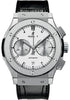 45 mm (available in 42 mm) polished and satin finished titanium case, vertical satin-finished titanium bezel with 6 H-shaped titanium screws, sapphire crystal with anti-reflective treatment, silver opalin dial with satin-finished rhodium-plated appliques and polished rhodium-plated hands, HUB1143 self-winding movement with chronograph, approximately 42 hours of power reserve, black rubber and alligator strap, stainless steel deployant buckle. Water resistant to 50 meters.