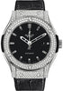 45mm titanium case set with 208 diamonds (1.75ct), sapphire crystal back, titanium bezel set with 126 diamonds (1.60ct), black composite resin lateral inserts and bezel lugs, mat black dial, self winding HUB 1112 movement, approximately 42 hours of power reserve, black rubber and alligator strap with deployant buckle. Water resistant to 50 meters.