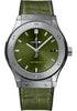 45 mm satin-finished and polished titanium case, satin-finished and polished titanium bezel with 6 H-shaped titanium screws, sapphire crystal with anti-reflective treatment, satin-finished green sunray dial, HUB1112 self-winding movement with movement, approximately 42 hours of power reserve, black rubber and green alligator strap, stainless steel deployant buckle. Water resistant to 50 meters.