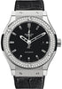45mm zirconium case, sapphire crystal back, zirconium bezel set with 126 diamonds (1.60ct), black composite resin lateral inserts and bezel lugs, mat black dial, self winding HUB 1112 movement, approximately 42 hours of power reserve, black rubber and alligator strap with deployant buckle. Water resistant to 50 meters.