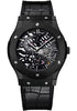 Hublot Classic Fusion Extra-Thin Skeleton Black Ceramic Watch 45mm polished and satin finished black ceramic case, black ceramic bezel vertical satin finish, sapphire dial with glossy grey transfer Hublot logo in pantone 425, hand-wound skeleton HUB 1300 movement with small seconds at 7 o'clock, approximately 90 hours of power reserve, black alligator and rubber strap with deployant buckle. Water resistant to 50 meters.