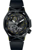 Hublot Novelties Techframe Ferrari Tourbillon Chronograph Carbon Yellow Limited Edition of 70 Watch 45 mm peek carbon fiber case with titanium screws, sapphire crystal with anti-reflective treatment, sapphire crystal and polished black dial, HUB6311 manual-winding movement with skeleton tourbillon chronograph, approximately 115 hours of power reserve, black smooth rubber strap, black-plated titanium deployant buckle. Water resistant to 30 meters.