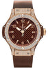 Hublot Big Bang 38 Cappuccino Gold Watch 38mm 18K red gold case, 18K red gold bezel set with 126 diamonds, diamond lugs, chocolate carbon dial, quartz movement, chocolate rubber strap with deployant buckle. Water resistant to 100 meters.