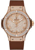 Hublot Big Bang 38mm 361.PC.9010.RC.1704 38mm 18K red gold case set with 194 diamonds (0.82ct), 18K red gold bezel set with 126 diamonds (0.87ct), brown composite resin lateral inserts and bezel lugs, diamond paved dial, quartz HUB 2900 movement, chocolate rubber strap with deployant buckle. Water resistant to 100 meters.