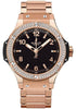 38mm 18K red gold case, 18K red gold bezel set with 126 diamonds (0.87ct), black composite resin lateral inserts and bezel lugs, black dial, quartz HUB 2900 movement, 18K red gold bracelet. Water resistant to 100 meters.