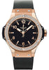 38mm 18K red gold case, 18K red gold bezel set with 126 diamonds, black dial, quartz movement, black rubber strap with deployant buckle. Water resistant to 100 meters.
