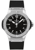 38mm stainless steel case, stainless steel bezel set with 126 diamonds, black dial, quartz movement, black rubber strap with deployant buckle. Water resistant to 100 meters.